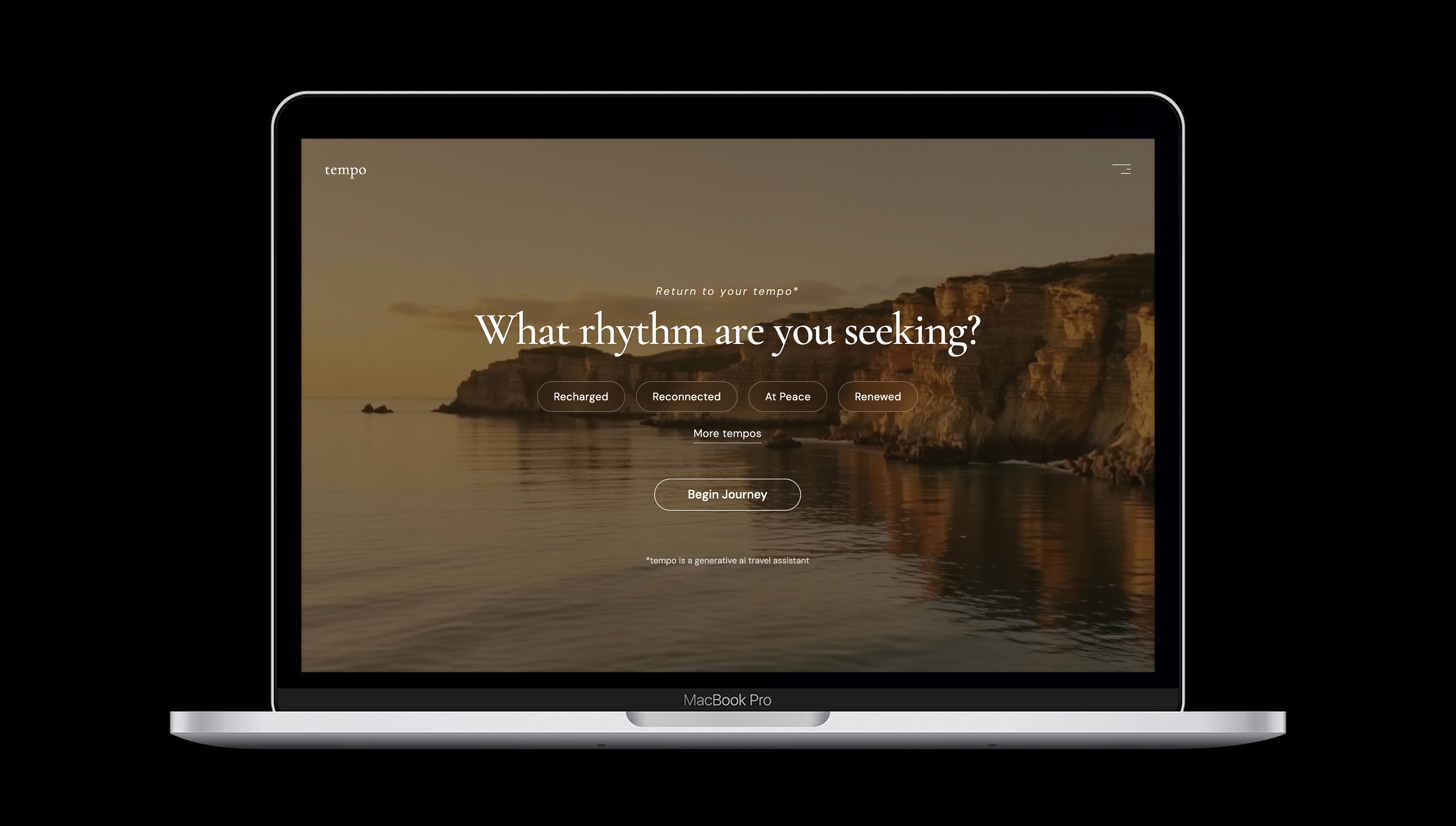 A feeling-first AI travel planning assistant, tempo opens not with a search bar but with a mood. Recharged, Reconnected, At Peace, Renewed. The AI uses that emotional signal as its starting point and builds a complete journey around it. Not a ranked list of destinations. An experience designed to deliver the feeling the traveler is actually seeking.